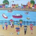 Description: An original Acrylic painting by Artist Casimira Mostyn on a 2” deep box canvas. This colourful quirky painting conveys people contemplating in the rain. The painting is quirky and colourful and has a fun feel to it