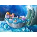 Description: An original acrylic painting by Ann Priddy framed in a white wooden frame. The little harbour has travelled far to find a new home, making its way in an upturned umbrella and finally reaching land.