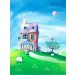 Description: An original acrylic painting by Ann Priddy framed in a white wooden frame. Fly in a hot air balloon to the magical cake shop surrounded by sheep and enjoy those tasty cakes.