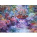 Red bridge, oil on canvas in a colourful setting of gardens and trees in several colours  of reds, greens, blues, yellows and pinks.