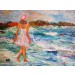 Girl in white dress and red hat walking her small dog on a windswept beach, the waves lapping wildly at her feet against a dramatic setting and sky.